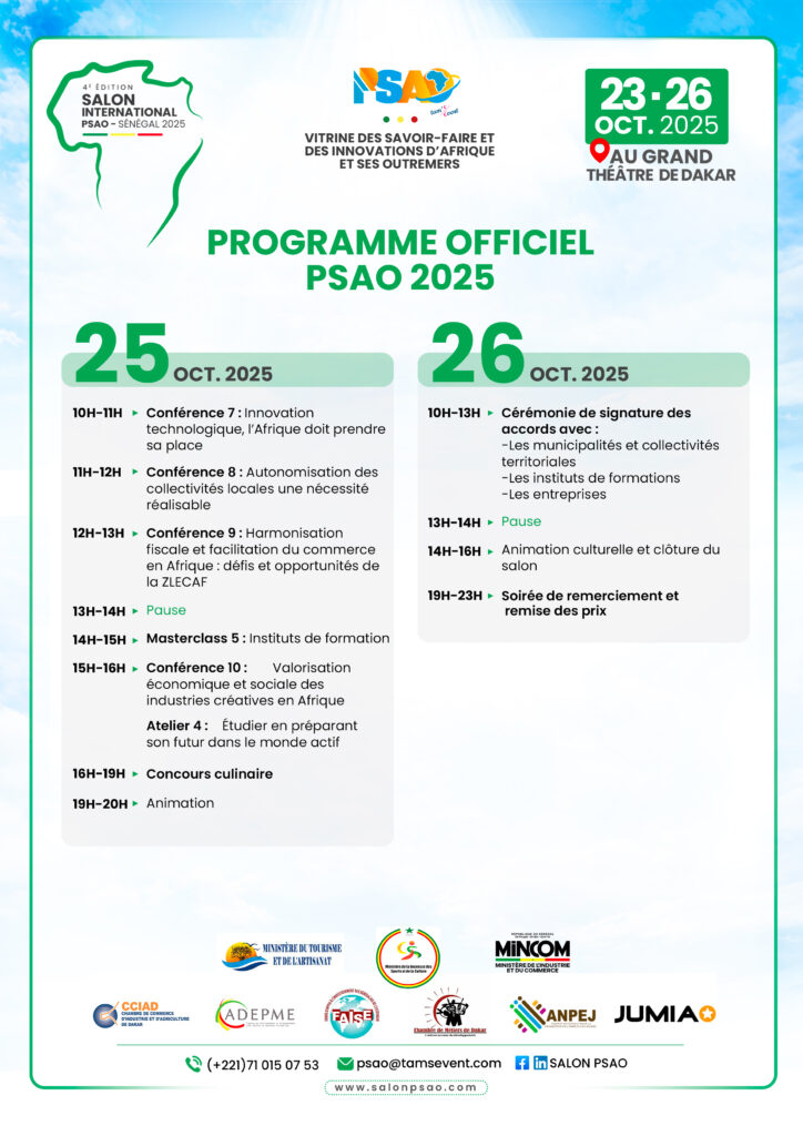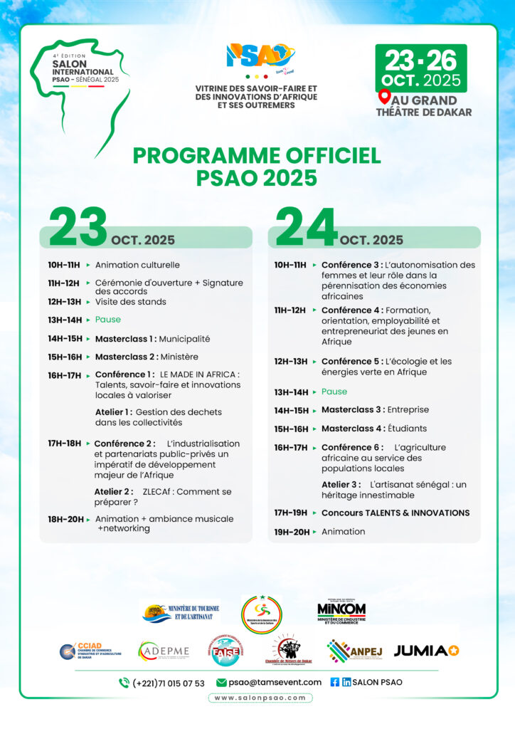 La 4e édition du Salon international des Produits et Services d’Afrique et de ses Outremers (PSAO) se tiendra du 23 au 26 octobre 2025 au Grand Théâtre National de Dakar, au Sénégal .